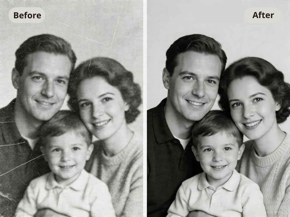 Expertly restore 1950s black and white family photos by removing scratches, reducing noise, and increasing clarity. It reconstructs facial expressions lost to aging and paper damage, preserving your family history in high definition. For comprehensive damage repair, try our dedicated photo restoration tool.