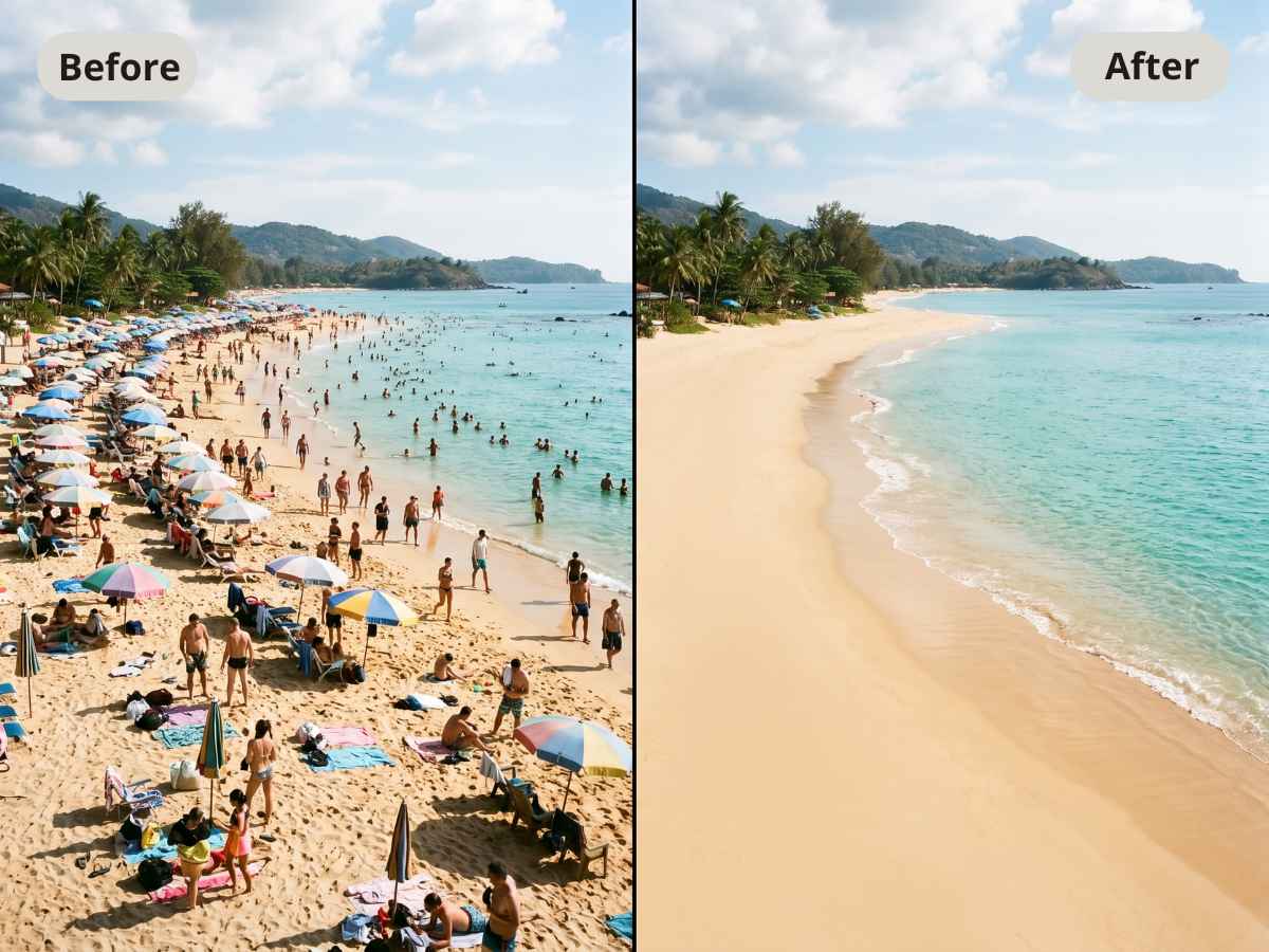 Watch as distracting tourists and crowded beachgoers are seamlessly erased from your breathtaking holiday shots. The AI intelligently reconstructs the background—matching the sand and water perfectly—so it looks as if the strangers were never even there.